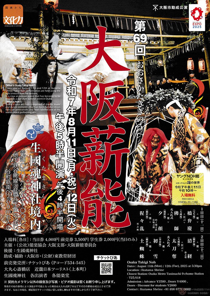 お知らせ 2025年8月11日 第69回大阪薪能 順延について 2025年8月11日(月.祝)、8月12日㈫、生國魂神社で二日間催される第69回大阪薪能ですが、第一日目の11日(月.祝)が雨天のため翌日12日㈫に順延となりました。 したがって二日目12日㈫の演目も翌13日㈬に催されることになりますのでご了承ください。 また、何かございましたらお知らせいたします。 よろしくお願いいたします。 関連