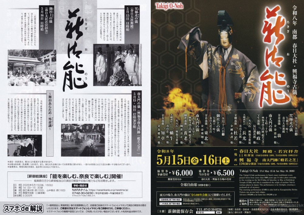 チケットは主催の薪御能保存会(TEL0742-30-0230)にて承っております。