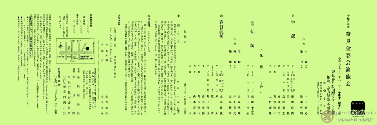 令和8年6月28日㈰ 午後12時半より奈良金春会演能会が奈良春日野国際フォーラム甍で催されます。